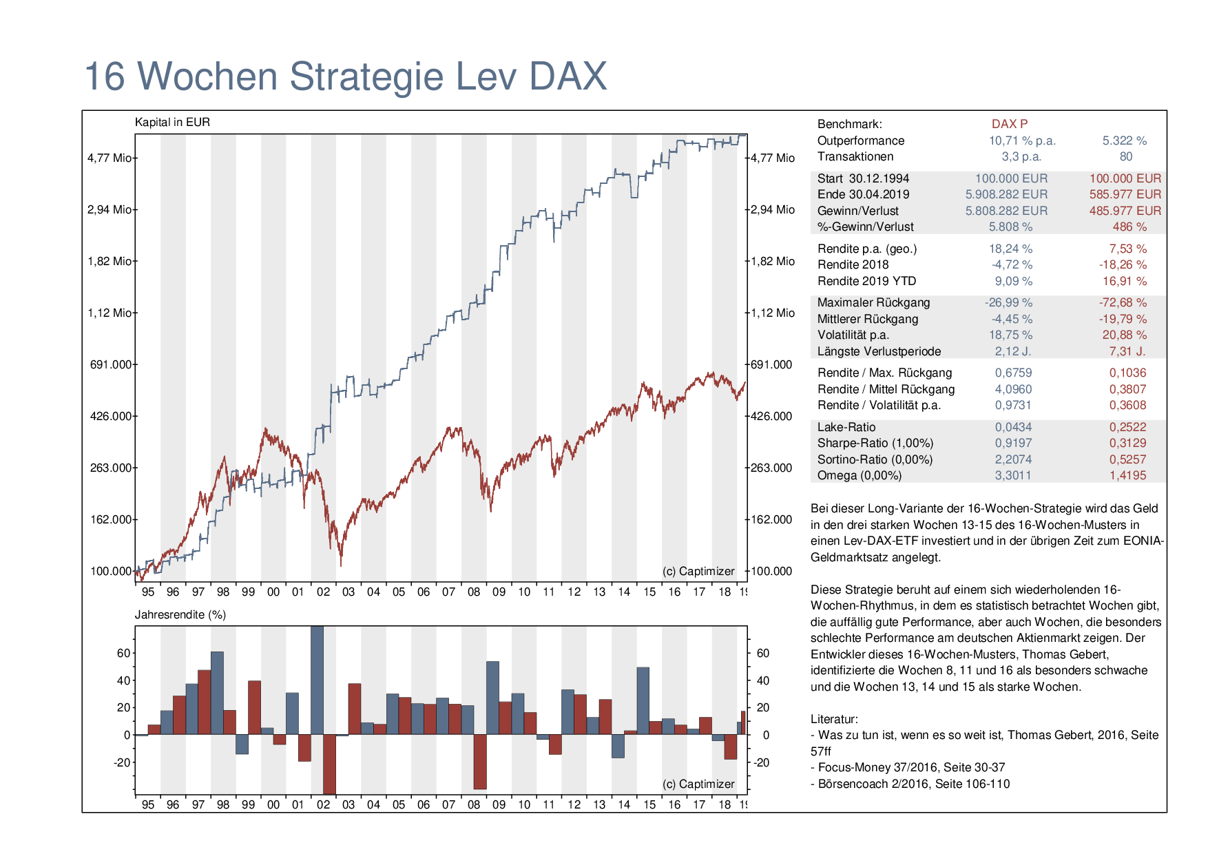 Bei dieser Long-Variante der 16-Wochen-Strategie wird das Geld in den drei starken Wochen 13-15 des 16-Wochen-Musters in einen Lev-DAX-ETF investiert und in der übrigen Zeit zum EONIA-Geldmarktsatz angelegt.